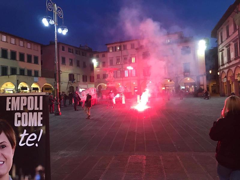 Stop omofobia e razzismo: Empoli antifascista. Con questo striscione e un fumogeno rosso alcuni manifestanti si sono presentati in piazza Farinata degli Uberti, con la faccia rivolta direttamente al lato in cui trova spazio il comitato elettorale del Centrodestra. L'evento è avvenuto pochi minuti dopo le manifestazioni Fridays For Future: in quella di via Del Papa ha partecipato anche il candidato sindaco Andrea Poggianti, presente in sede al momento dell'arrivo di striscione e fumogeno. Non ci sono stati feriti durante l'evento, i manifestanti si sono tenuti a distanza dalla sede per la durata del 'flash mob'. Questa esternazione è l'ennesima dopo i duri scambi in Consiglio comunale e nell'agorà 'virtuale' dei social network a seguito della revoca della cittadinanza onoraria di Benito Mussolini a Empoli e delle minacce giunte ai simpatizzanti del M5S e del Centrodestra, per le quali Poggianti ha sporto denuncia.
