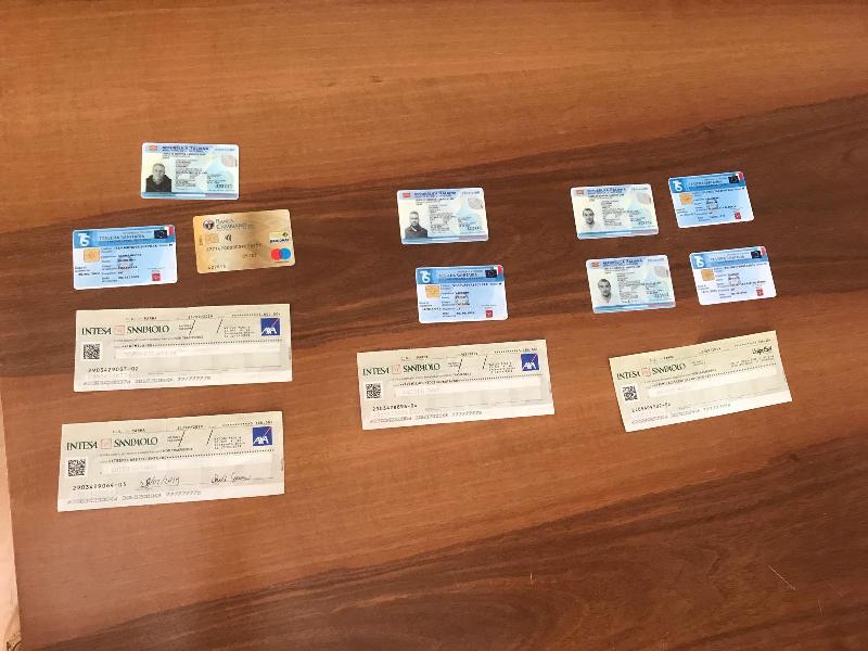 Indosso ai tre sono state rinvenute, oltre ai documenti veri di identità, 4 tessere sanitarie, 4 carte di identità false, uno dei tre aveva tra l’altro 2 false identità con la sua vera effige, nonché 4 assegni provenienti da agenzie di assicurazioni del nord Italia, per un importo complessivo di circa 15.000 euro, che sono stati sequestrati.