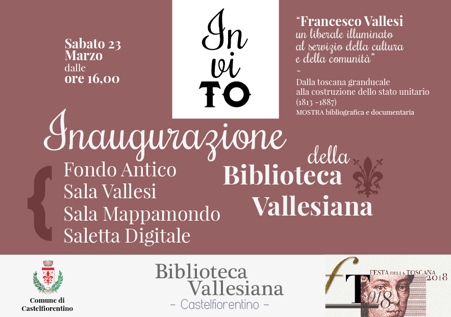 A partire dalle 15.30, è in programma l’apertura straordinaria della sezione ragazzi e del “giardino segreto” dove sono previste attività di laboratorio e giochi, anche all’aperto. Alle 16.00, un attore darà vita a una performance teatrale per “guidare” i presenti fino al secondo piano, dove è previsto il taglio del nastro. Una breve mostra documentaria presenterà quindi la figura di Francesco Vallesi, ricostruendone – anche con l’ausilio di documenti inediti – la biografia, fino alle tappe che segnarono la nascita della biblioteca. Su questi aspetti interverrà anche il dott. Paolo Marini, che ha scritto una interessante tesi di laurea sulle origini della “Vallesiana”.