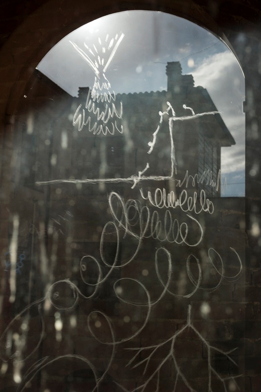 Io le parole le mangerei è un progetto concepito appositamente per la biblioteca che la trasforma in un inusuale spazio espositivo dal forte potere immaginifico, sottolineandone l’importanza come luogo di stimolo per la conoscenza in senso lato. L’intervento si sviluppa sulle cinque vetrate che, tra il primo e il secondo piano, si affacciano sul cortile interno del palazzo e, proprio per questo, può essere osservato da diversi punti dello spazio. Il risultato è un’opera ambientale leggera ma presente. Ogni vetro è un capitolo di una raccolta di racconti, una narrazione incisa pensata come un ciclo di affreschi medievali. Io le parole le mangerei fonde l’arte visiva con la letteratura, il disegno con la scrittura. L’artista, infatti, prima attraverso la tecnica del disegno automatico e poi attraverso l’incisione su vetro, ha tradotto in immagini i racconti dei poeti Anedda, Cucchi, Lamarque e Pellegatta, legati al tema della libertà. La narrazione si apre con la vetrata speciale: “In omaggio a Andrea Zanzotto”, poeta italiano tra i più importanti del secondo Novecento e citato da tutti gli autori coinvolti nel progetto.