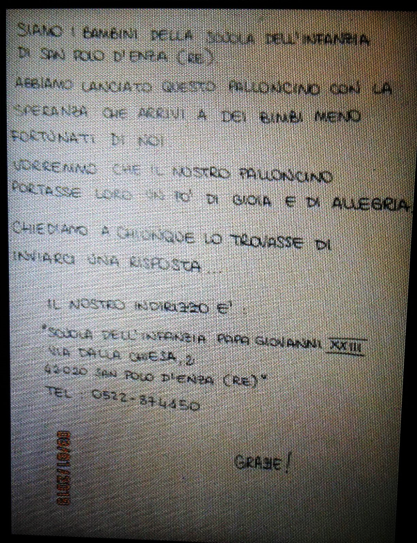 Da San Polo D’Enza (Reggio Emilia) a Scarperia la letterina attaccata ad un palloncino azzurro percorre più di 100 km e viaggia per quindici giorni.