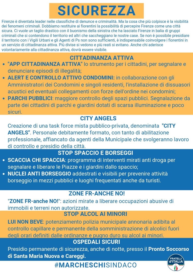 “Nella campagna di ascolto che sto conducendo nelle piazze e tra la gente, il tema “Sicurezza” è quello più sentito. I cittadini fiorentini chiedono una vigilanza attiva, più presente sul territorio. C’è il rischio che i cittadini si organizzino con ronde per difendere proprietà e incolumità personali e delle loro famiglie. Prima che qualcuno si organizzi con “sentinelle”, lancio le mie proposte per una “Cittadinanza attiva”, un principio altruistico di difesa. Non solo difendere se stessi dietro le sbarre ma aiutare i vicini di casa, fare rete per difendere strade e piazze, far prevalere l’idea di comunità. Inoltre si deve rendere visibile la sicurezza, più divise e pettorine si vedono e più reati si evitano. Le divise le vogliono i fiorentini, la Sinistra si rassegni. Propongo una Task force, i 'City Angels', tra volontari addestrati e istituti di vigilanza coordinati dalla Prefettura. Noi fiorentini siamo stati famosi nel mondo con gli 'Angeli del fango', ora c’è invece bisogno degli 'Angeli della sicurezza' contro l’alluvione di criminalità, angeli della sicurezza per difendere Firenze –spiega il Consigliere regionale e candidato sindaco di Firenze Paolo Marcheschi (Fdi)- Deve essere anche chiaro che i vigili nuovi assunti a Firenze non devono aspirare ad avere un posto pubblico come dipendente comunale, per stare in ufficio o andare a fare le multe, ma deve essere motivato a segnalare, presidiare, rincorrere il malvivente. La Polizia municipale può e deve diventare un presidio di sicurezza e legalità”.