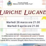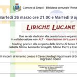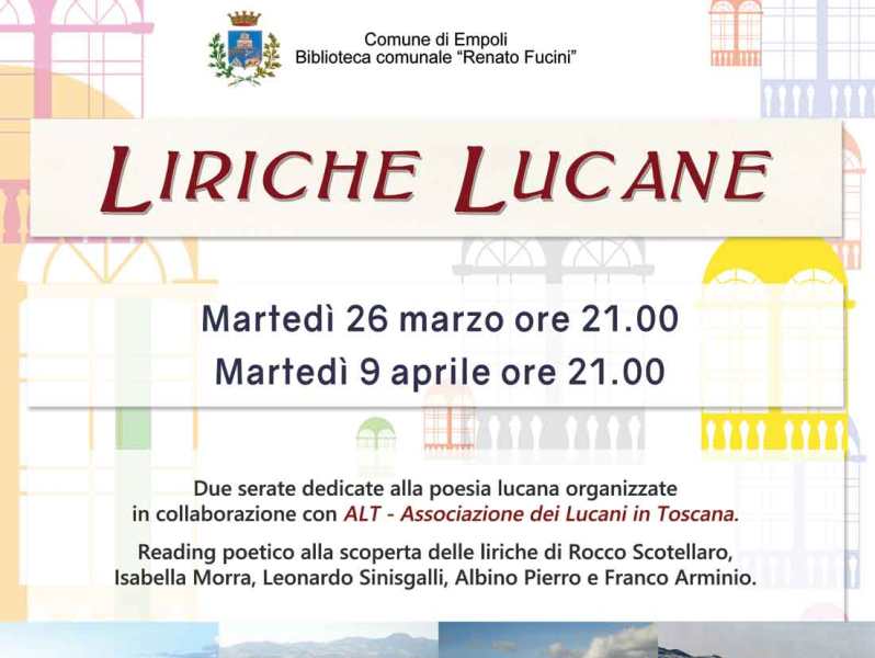 La Biblioteca comunale “Renato Fucini” di Empoli organizza in collaborazione con ALT - Associazione dei Lucani in Toscana due serate dedicate ai poeti lucani d’origine o d’adozione. Saranno reading poetici alla scoperta delle liriche di Rocco Scotellaro, Isabella Morra, Leonardo Sinisgalli, Albino Pierro, e Franco Arminio.