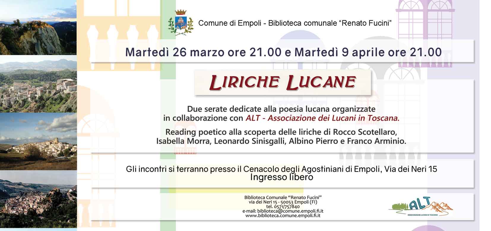 La Biblioteca comunale “Renato Fucini” di Empoli organizza in collaborazione con ALT - Associazione dei Lucani in Toscana due serate dedicate ai poeti lucani d’origine o d’adozione. Saranno reading poetici alla scoperta delle liriche di Rocco Scotellaro, Isabella Morra, Leonardo Sinisgalli, Albino Pierro, e Franco Arminio.
