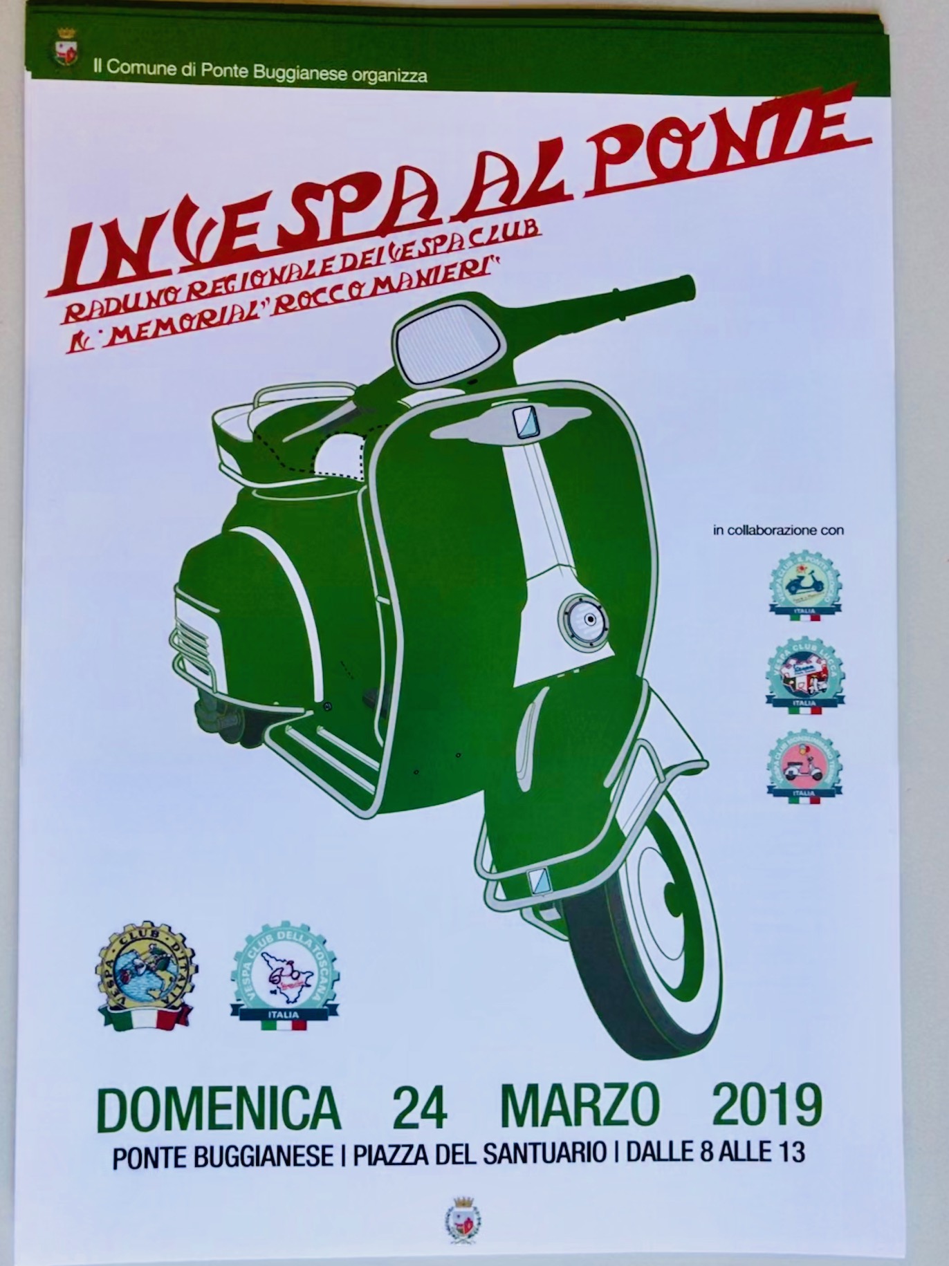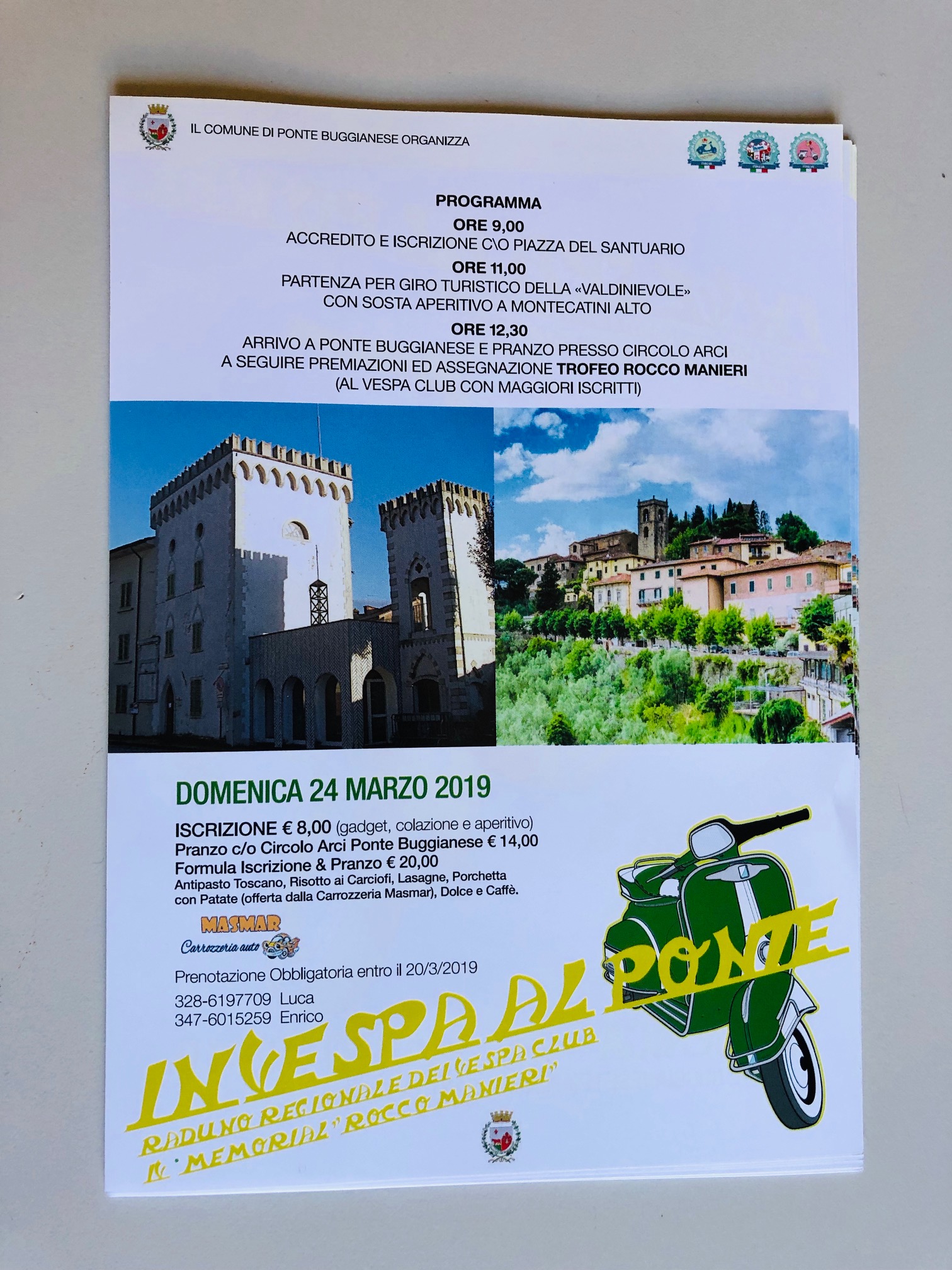 Domani, domenica 24 marzo 2019 il Comune di Ponte Buggianese in collaborazione con il Vespa Club il Ponte Mediceo, il Vespa Club Monsummano Terme e Vespa Club Lucca, organizza la 6° edizione del raduno "In vespa al Ponte".