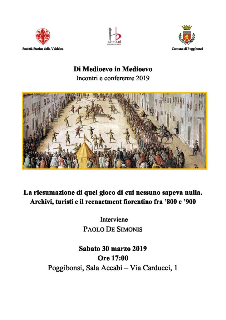 La Società Storica della Valdelsa promuove la conferenza "La riesumazione di quel gioco di cui nessuno sapeva nulla. Archivi, turisti e il reenactment fiorentino fra '800 e '900", relatore Paolo De Simonis. La conferenza avrà luogo sabato 30 marzo alle 17 presso l'Accabì nell'ambito del progetto "Di medioevo in medioevo", in corso dal 2018 e incentrato su forme ed espressioni del medioevo storico e del 'medioevo reinventato'.