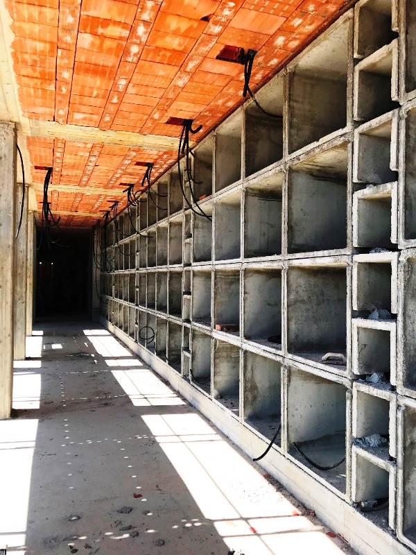 Nella progettazione dell’installazione di loculi e ossarini lo spazio è stato ottimizzato in modo innovativo. I pilastri strutturali sono stati disposti in modo arretrato, ogni quattro loculi, al fine di poter ricavare una colonna di nuovi ossari.