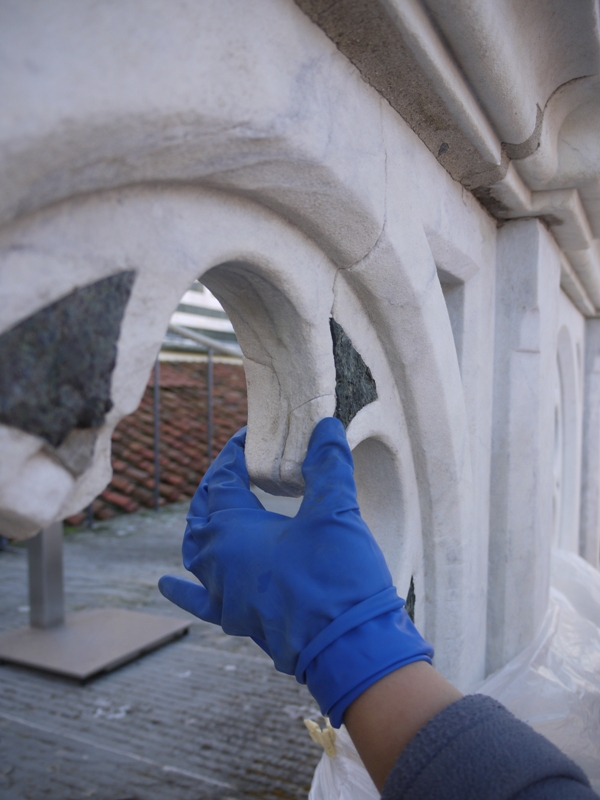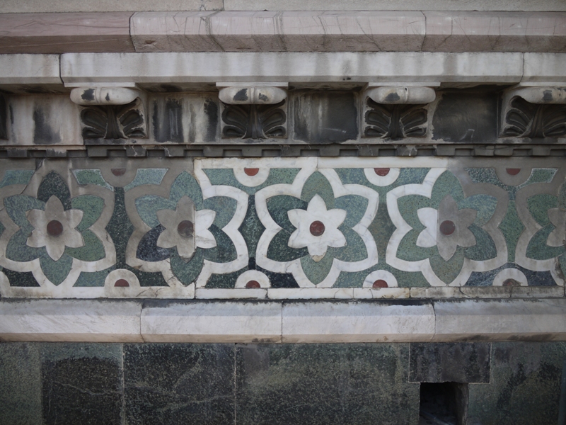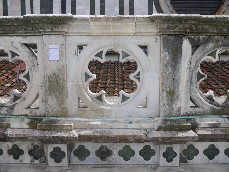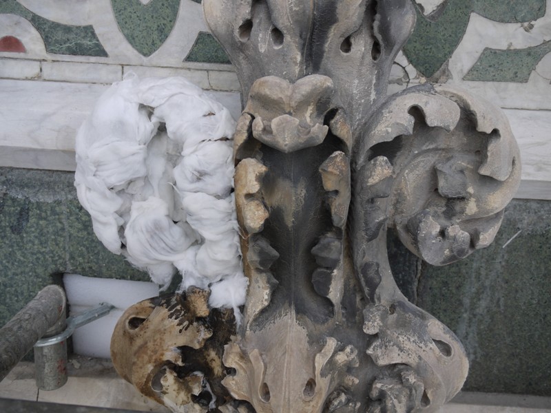 Prima dell’intervento odierno la facciata si presentava strutturalmente sana nel suo complesso, ma fortemente degradata negli elementi marmorei e ricoperta da uno strato scuro e di spessore variabile causato dai depositi atmosferici. I fenomeni di degrado che interessavano la porzione di parete Nord della Cattedrale sono quelli tipici del contesto urbano in cui sono collocati i monumenti dell’Opera di Santa Maria del Fiore e delle caratteristiche dei materiali: formazioni di croste nere, depositi superficiali, dilavamento da acqua piovana e sostanze inquinanti e corrosive con la conseguente mutazione della superficie originale fino alla perdita di intere porzioni di modellato, fratture, microfratture e alterazione biologica sia fungina che batterica.