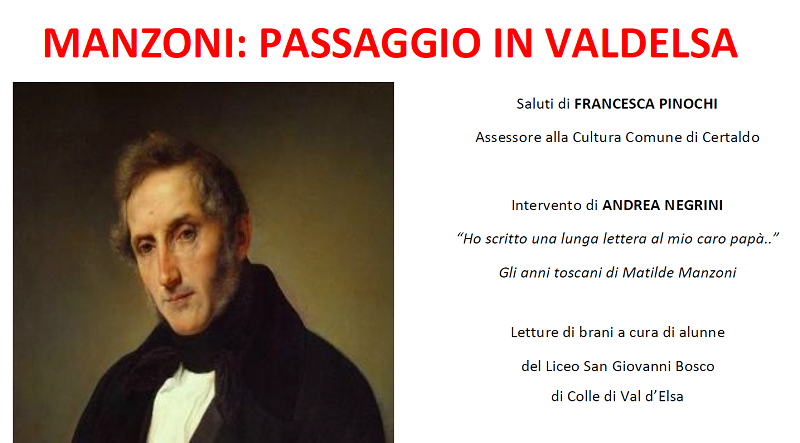 Venerdì 5 aprile 2019 alle ore 16,30, nella Chiesa dei Santi Tommaso e Prospero in Certaldo Alta, si terrà l'incontro “Manzoni: passaggio in Valdelsa”. Questo il programma: saluti dell’Assessore alla Cultura Comune di Certaldo; intervento di Andrea Negrini “Ho scritto una lunga lettera al mio caro papà...” Gli anni toscani di Matilde Manzoni; Letture di brani a cura di alunne del Liceo San Giovanni Bosco di Colle di Val d’Elsa; nell’ambito del progetto “Teatrando” progetto di alternanza scuola-lavoro curato dalla Cooperativa Sociale “Valle del sole” “Un miniAdelchi” di Alessandro Manzoni. Coordina l’iniziativa Enzo Linari, Società Storica della Valdelsa.