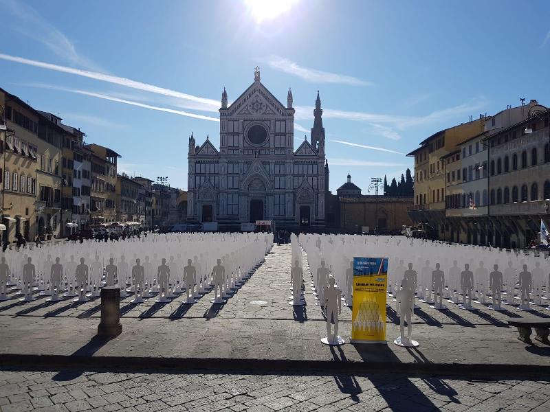 Il tour dell’UGL “Lavorare per Vivere” arriva a Firenze per ricordare le 1133 vittime sul lavoro nel 2018. Centinaia di sagome bianche hanno inondato Piazza Santa Croce creando un suggestivo impatto visivo. L’obiettivo è quello di sensibilizzare le Istituzioni e i cittadini affinché sia rispettato e garantito il diritto alla sicurezza sul lavoro.