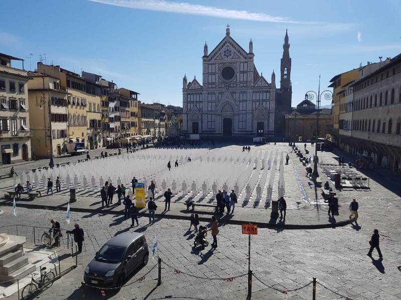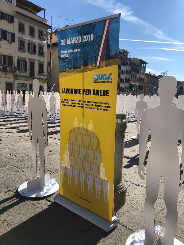 Il tour dell’UGL “Lavorare per Vivere” arriva a Firenze per ricordare le 1133 vittime sul lavoro nel 2018. Centinaia di sagome bianche hanno inondato Piazza Santa Croce creando un suggestivo impatto visivo. L’obiettivo è quello di sensibilizzare le Istituzioni e i cittadini affinché sia rispettato e garantito il diritto alla sicurezza sul lavoro.