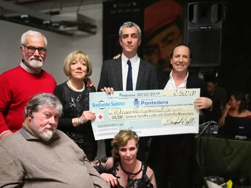 Pienamente riuscito l'evento organizzato a Pontedera da Comune di Pontedera, Croce Rossa e Badante Subito per raccogliere fondi a favore della UILDM Unione italiana Lotta alla Distrofia Muscolare. Il Centrum Sete Sois Sete Luas si è riempito di trecento ballerini di tango provenienti da tutta la Toscana che fino a notte fonda hanno dato vita ad una Milonga solidale, questo il nome con il quale vengono chiamati i raduni organizzati dai tangueros per raccogliere fondi a favore di iniziative benefiche. A fine serata l'assessore al sociale del Comune di Pontedera Marco Cecchi e la titolare di Badante Subito Stefania Masoni hanno consegnato nelle mani dei vertici locali e nazionali di UILDM rappresentati da Vilma Lupi, Angelo Giuntinelli ed Enzo Marcheschi ben 2300 euro (su un incasso totale di 2500 euro) che verranno utilizzati per promuovere borse di studio a favore della ricerca e per attività di consulenza e supporto per coloro che sono colpiti dalla distrofia muscolare.