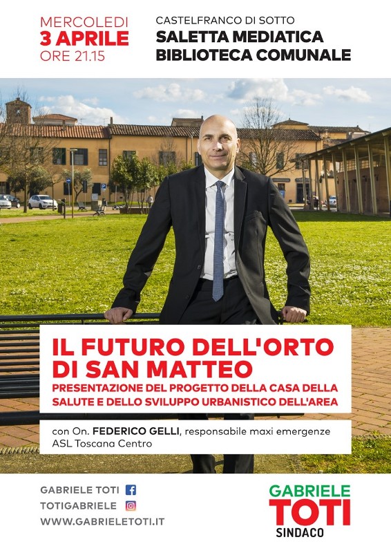 “In questi anni - afferma il candidato ed attuale Sindaco, Gabriele Toti - con la mia Giunta abbiamo sviluppato e messo in campo un progetto di riqualificazione per tutta la zona dell’Orto di San Matteo che nei prossimi tre anni cambierà radicalmente per i tanti progetti ed investimenti che saranno realizzati da Comune e privati. Per questo mercoledì sera, nel secondo incontro pubblico, presenteremo il progetto della “Casa della Salute” con la nuova farmacia comunale, l’intervento su Piazza Ungaretti (davanti al Cimitero Comunale), il recupero ex Lorbac ed illustreremo come cambierà tutta questa zona a ridosso del centro storico diventando ancora più centrale per Castelfranco - conclude Toti”