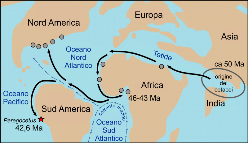 Il suo nome è Peregocetus pacificus, che significa "il cetaceo viaggiatore che ha raggiunto il Pacifico", e il ritrovamento del suo scheletro fossile in sedimenti di oltre 42 milioni di anni fa è stato fondamentale per ricostruire la rotta seguita dagli antenati di balene e delfini nel lungo viaggio che, fra i 50 e i 40 milioni di anni fa, li portò dal loro centro di origine fra India e Pakistan a colonizzare tutti gli oceani.