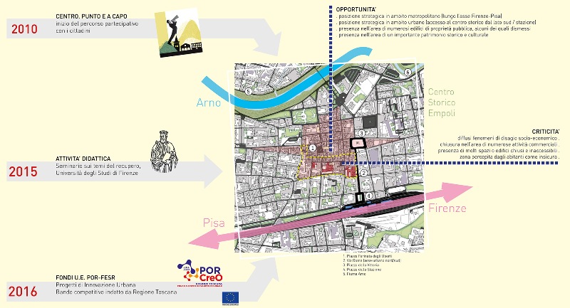 STORIA - Il progetto nasce nell’ambito dei Progetti di Innovazione Urbana della Regione Toscana, finanziati con fondi strutturali europei POR-FESR 2014-2020 e destinati ad azioni di rigenerazione sulle città. La proposta, anticipata da un processo partecipativo con i cittadina già nel 2010 e approfondito con attività di workshop e seminari coordinati dall'Università degli Studi di Firenze, trova la sua finalizzazione con la partecipazione al bando nel 2015, predisponendo un programma di interventi per il centro storico di Empoli ispirati da un’idea di città inclusiva, catalizzatrice di processi di rigenerazione sociale, economica e ambientale. Il progetto, che prevede interventi per 8,1 milioni di euro, ha ottenuto un finanziamento di 4,8 milioni di euro dall’Unione Europea, attraverso la Regione Toscana. Gli interventi, in parte già avviati, si completeranno entro il 2021 con il rilancio del centro storico e con un nuovo slancio per tutta la città di Empoli.