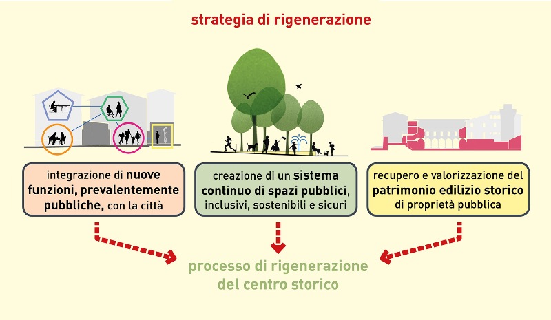Le funzioni saranno integrate con il resto della città attraverso un progetto complessivo di riordino dello spazio pubblico quale elemento cardine del percorso di rigenerazione urbana.