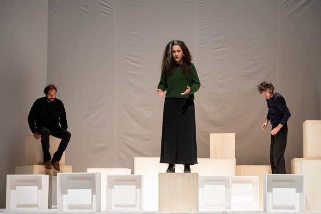 La scenografia interamente bianca, minimalista, con monoliti a forma cubica, astrae la strage dal contesto per evidenziare la sua universalità: un’umanità crudele che cannibalizza se stessa.