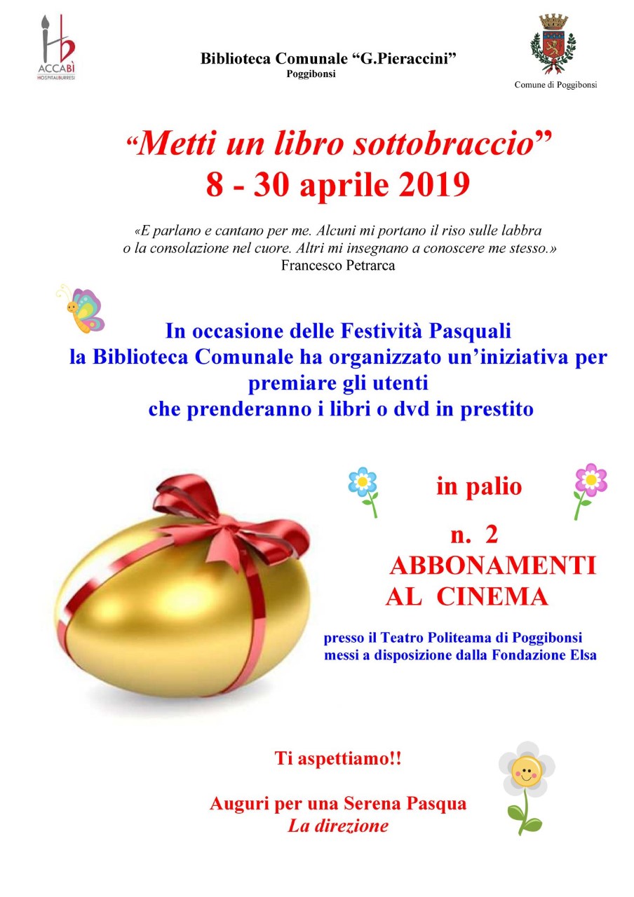 E’ iniziata la nuova edizione di “Metti un libro sottobraccio”, iniziativa di promozione alla lettura che si svolge alla biblioteca comunale Gaetano Pieraccini. Iniziativa che viene riproposta per il terzo anno consecutivo per il periodo delle festività pasquali dopo il grande e crescente successo riscosso nelle precedenti edizioni (sia per la Pasqua che per il Natale).