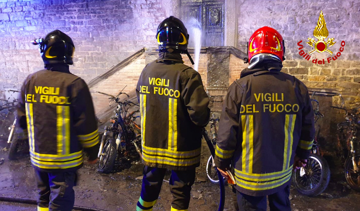 I Vigili del Fuoco del Comando di Firenze sono intervenuti questa notte con 2 automezzi e 7 unità, in via Mazzetta, per un incendio che ha coinvolto 15 motorini. Danneggiata anche una vettura parcheggiata e la porta laterale della chiesa di San Felice in Piazza. Non si segnalano persone coinvolte e le cause sono in corso di accertamento.