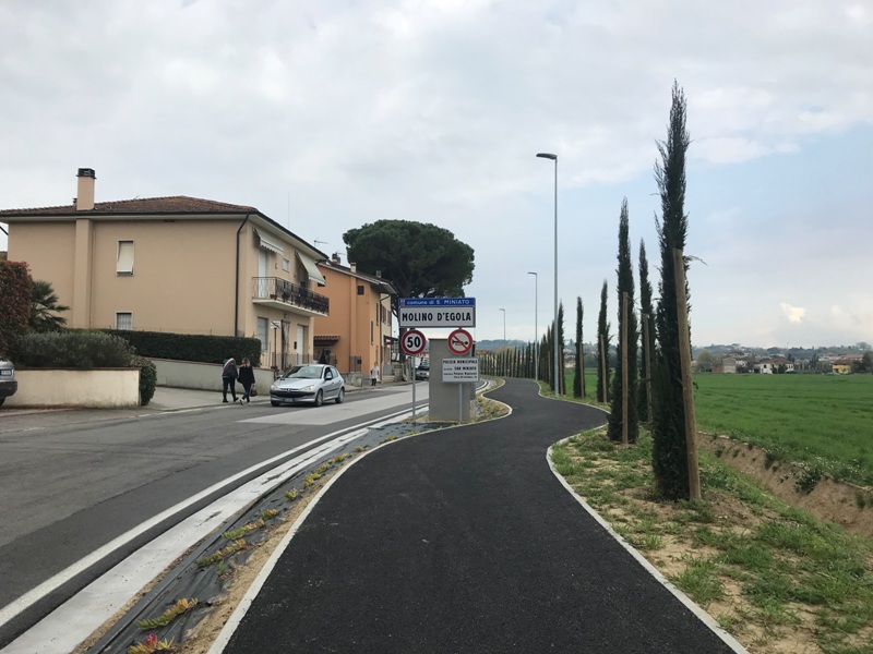 Il tratto appena concluso si inserisce in un masterplan che prevede il collegamento pedonale e ciclabile della frazione di Molino d'Egola a Ponte a Egola. Il primo tratto appena concluso si estende parallelamente al lato Ovest della Via San Giovanni Battista e comprende la statale n. 67 Tosco-Romagnola fino all’innesto tra via San Giovanni Battista e via Castelvecchio. In questa fascia di terreno, oltre alla carreggiata della pista ciclopedonale vera e propria, sono state realizzate anche una serie di opere necessarie per la regimazione delle acque meteoriche, oltre all’installazione della pubblica illuminazione e il posizionamento della nuova segnaletica stradale, per un costo complessivo di circa 170mila euro.