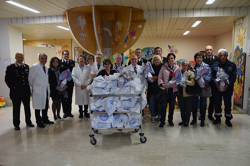 Mattinata speciale nel Dipartimento Materno Infantile dell’Azienda ospedaliero-universitaria Senese, grazie alla visita dell’Arma dei Carabinieri e dell’Associazione Nazionale Carabinieri, accompagnati da una delegazione dell'Associazione Italiana per la lotta al Neuroblastoma di Milano, con la presidente Sara Costa. I carabinieri hanno portato 100 uova di Pasqua ai piccoli pazienti del policlinico Santa Maria alle Scotte e alle loro famiglie. «Ringraziamo di cuore i carabinieri – ha detto Valtere Giovannini, direttore generale – per essere sempre vicini alle esigenze dei piccoli pazienti, con grande sensibilità e affetto». A fare gli onori di casa il professor Salvatore Grosso, direttore della UOC Pediatria, e la dottoressa Claudia Basagni in rappresentanza della Direzione sanitaria. Presenti all’evento il comandante provinciale dell’Arma dei Carabinieri, colonnello Stefano di Pace, e il presidente dell’Associazione Nazionale Carabinieri, sezione di Castellina e Radda in Chianti, vice brigadiere in congedo Beniamino De Gaetano. Per i piccoli degenti dell’ospedale di Siena si è trattato di una sorpresa quanto mai piacevole, gradita e gustosa. Un momento molto importante anche per l’Arma dei Carabinieri da sempre molto vicina e sensibile alle famiglie che si trovano ad affrontare le degenze dei loro piccoli all’interno del policlinico delle Scotte.