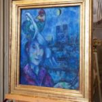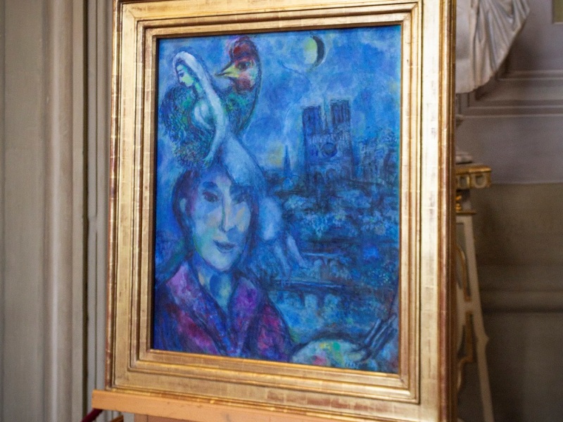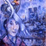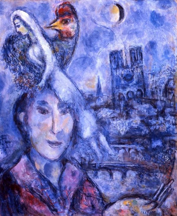 Avvolti nel colore blu, la “tinta della sua anima”, come amava affermare Chagall stesso, nel dipinto compaiono accanto al suo volto tutti gli elementi più cari all’artista: la moglie Bella, il gallo simbolo della sua madre patria Russia, la tavolozza con i pennelli e sullo sfondo Parigi con Notre-Dame e il ponte sulla Senna, sotto un cielo che mostra contemporaneamente il sole e la luna.