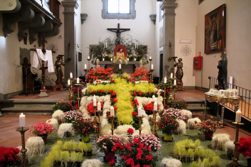 A San Casciano la Pasqua diventa un tableau di fiori e profumi che sboccia insieme all’antica tradizione religiosa del Sepolcro delle Vecce. Lo spettacolo floreale che simboleggia il passaggio dalla morte alla rinascita di Gesù Fino ha preso vita ieri sera e rimarrà aperto fino a lunedì 22 aprile nelle chiese del Suffragio e della Misericordia. Protagonisti i colori e le forme delle ricche composizioni floreali costituite da vecce e grano misti a fiori e piante di stagione quali gardenie, calle, margherite, begonie, ortensie azalee, gerani. Il Sepolcro delle Vecce è una tradizione tipica di San Casciano che gli abitanti non hanno mai abbandonato, un lavoro e uno spettacolo visivo di grande impatto, frutto di una passione radicata che ogni anno torna ad esprimersi grazie all’impegno instancabile di Paolo Bacci e di tutti coloro che collaborano con lui.