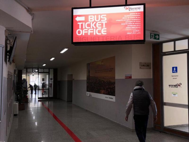 Nell’area sottostante, la biglietteria si rinnova come spazio e come informazioni veicolate, anche con nuovi linguaggi, come quello video grazie ai nuovi monitor installati internamente ed esternamente, i quali sono attivi anche quando lo spazio è chiuso al pubblico. Parallelamente l’offerta commerciale cresce, offrendo all’utente l’opportunità di acquistare numerose soluzioni di viaggio, che vanno da quelle territoriali (biglietti urbani ed extraurbani) fino a tutte le destinazioni nazionali ed internazionali. Il percorso che collega il piano strada a quello inferiore è così “guidato”, attraverso cartelli indicatori posizionati in più punti di contatto e integrati da frecce sul pavimento. Il cliente è così accompagnato fino al servizio che sta cercando.
