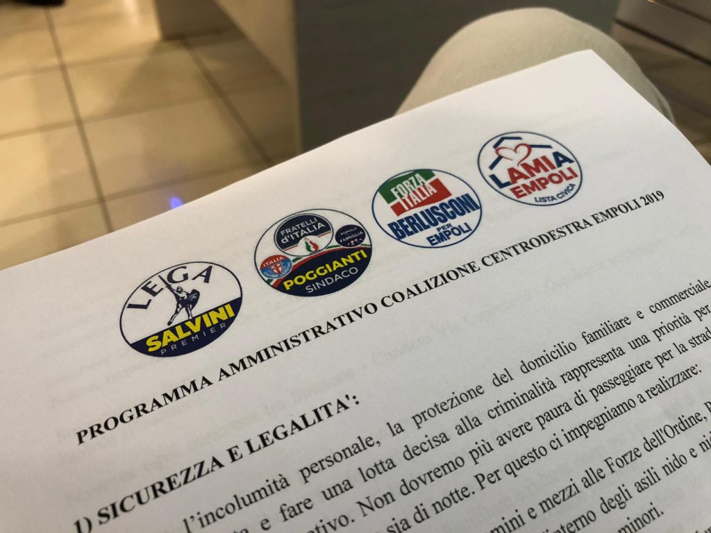 Un programma che viene prima della coalizione, questo sembra precisare Poggianti: "Quello che abbiamo sottoscritto non è un programma contro qualcuno – ha detto Andrea Poggianti – ma un progetto per la città. Non vogliamo mettere solo una bandierina del centrodestra su Empoli, ma mettere in pratica un programma frutto di percorso di ascolto e che abbiamo scritto tutti insieme, con i cittadini e le persone di buon senso. In questi anni la nostra città è stata vittima del malgoverno della sinistra, bloccata dal clientelismo e senza alcun principio di meritocrazia. La nostra sarà una battaglia per Empoli moderna, giusta e sicura".
