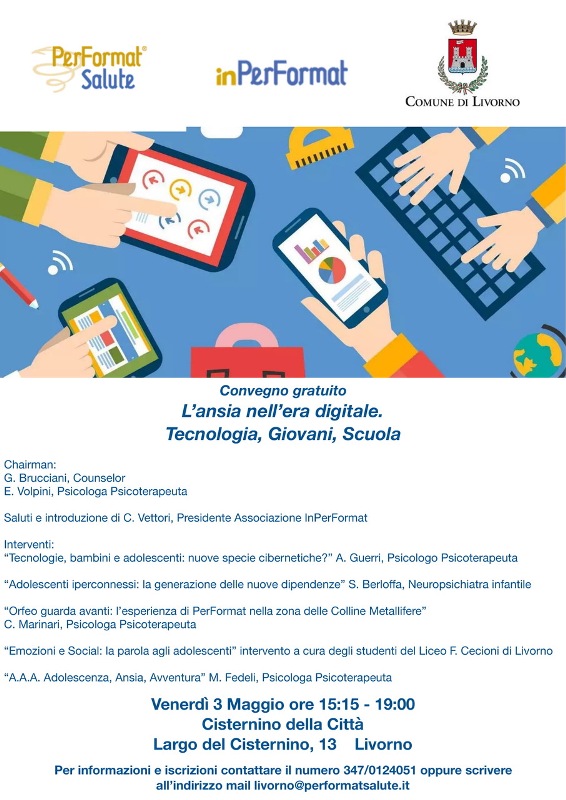 L’Associazione InPerFormat, con i centri PerFormat Salute Livorno, Vicarello e Cecina, e con il patrocinio del Comune di Livorno, organizza il convegno “L’ansia nell’era digitale. Tecnologia, Giovani, Scuola” in programma per venerdì 3 maggio alle ore 15 al Cisternino di Città.
