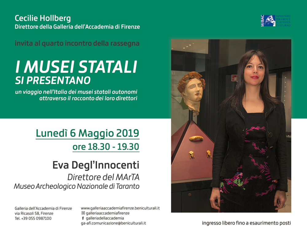 Continua il viaggio per l’Italia e i suoi straordinari tesori, offerto dalla Galleria dell’Accademia di Firenze: il prossimo appuntamento è lunedì 6 maggio, alle ore 18.30, con la conferenza di Eva Degl’Innocenti, direttore del MArTA, il Museo Archeologico Nazionale di Taranto.