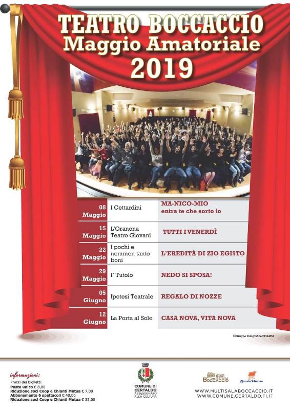 Organizzata e coordinata dal Comune di Certaldo in collaborazione con la società GrandeSchermo che gestisce il Multisala Boccaccio, la rassegna inizierà dunque mercoledì 8 maggio con la compagnia I Cettardini che porta in scena “Ma-Nico-Mio - entra te che sorto io”, spettacolo comico originale scritto e diretto dagli stessi attori ed ambientato nella Certaldo medievale di Boccaccio; si prosegue mercoledì 15 con “Tutti i venerdì” de L'Oranona Teatro Giovani, adattamento contemporaneo ispirato alle novelle di Nastagio degli Onesti e di Frate Cipolla del “Decameron”; mercoledì 22 maggio un tuffo nel vernacolo con I pochi e nemmen tanto boni e “L'eredità Di Zio Egisto”, tre atti brillanti di Antonella Zucchini su divertenti e scoppiettanti intrighi familiari; mercoledì 29 maggio sarà la volta de I' Tutolo con “Nedo si sposa!”, altra vicenda toscana con al centro il figlio attempato che decide finalmente di sposarsi ma non si sa bene con chi; mercoledì 5 giugno è la volta della compagnia Ipotesi Teatrale con “Regalo di nozze” due atti di Valerio Di Piramo, adattati da Sabrina Taddei e diretti da Elena Capone, anche in questo caso con tema matrimonio; chiusura di rassegna ancora col vernacolo, mercoledì 12 giugno con La Porta al Sole e lo spettacolo “Casa Nova, Vita Nova”, commedia brillante di Mario De Maio e Vinicio Cioli dedicata a litigi e segreti di due famiglie costrette a convivere in un appartamento troppo piccolo ma… speciale!...