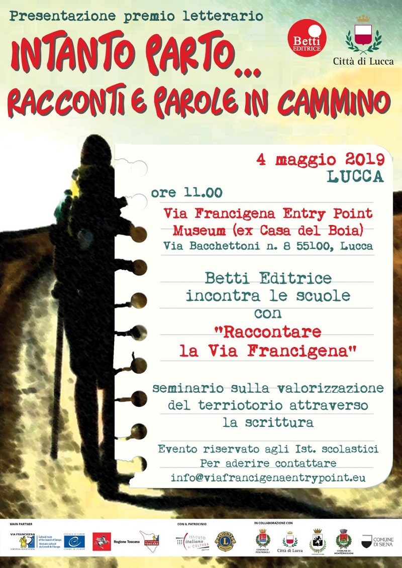 Al mattino, al Francigena Entry Point, si terrà "Raccontare la Via Francigena", incontro seminario riservato alle scuole superiori sui temi della narrazione e valorizzazione del territorio attraverso la scrittura. Nel pomeriggio verrà realizzato un trekking urbano lungo la via Francigena, accompagnato da una guida esperta che, partendo dalla Terrazza Petroni, attraverserà la città per raggiungere il museo Via Francigena Entry Point. Qui, dopo la visita al museo, si terrà l'incontro con uno degli autori vincitori del premio letterario. L'evento è gratuito. Le scuole e i partecipanti al trekking possono prenotarsi via mail o telefono, presso: Via Francigena Entry Point - ex Casa del Boia, via Bacchettoni 8, Lucca – tel. 0583.496554 - 342 1466451 - info@viafrancigenaentrypoint.eu