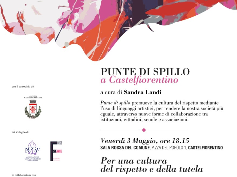 ·         Venerdì 3 Maggio, ore 18.15 - presso la Sala Rossa del Comune Di Castelfiorentino con "Per una cultura del rispetto e delle tutela" - parteciperanno Alessio Falorni, Rosa Maria Di Giorgi, Lorella Giglioli