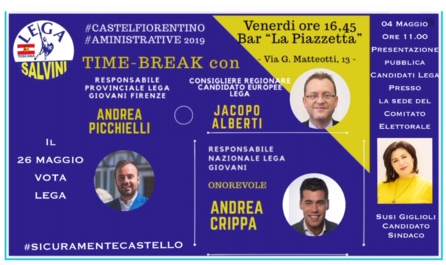 Venerdì 03 Maggio ore 16.45 a Castelfiorentino presso Bar “La Piazzetta” Via Garibaldi saranno presenti il Responsabile Provinciale e candidato capolista Lega alle amministrative di Empoli Andrea Picchielli, il Consigliere Regionale e candidato alle Europee Lega Jacopo Alberti e il Responsabile Nazionale Lega Giovani Onorevole Andrea Crippa. Parteciperà anche il Segretario Lega - Salvini Premier dell’Empolese Valdelsa Marco Cordone.