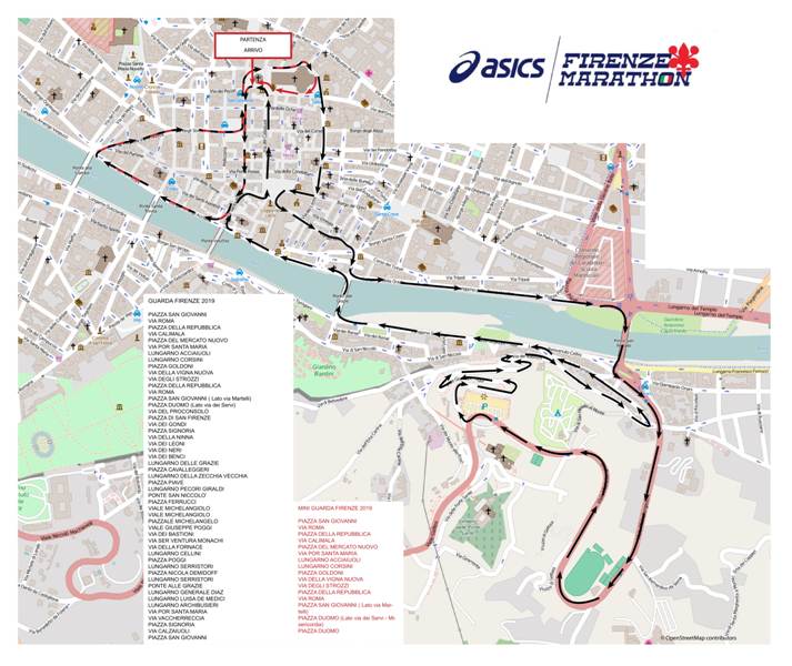 PIAZZA SAN GIOVANNI (angolo via Martelli), VIA ROMA, PIAZZA DELLA REPUBBLICA, VIA CALIMALA, PIAZZA DEL MERCATO NUOVO, VIA POR SANTA MARIA, LUNGARNO ACCIAIUOLI, LUNGARNO CORSINI, PIAZZA GOLDONI, VIA DELLA VIGNA NUOVA, VIA DEGLI STROZZI, PIAZZA DELLA REPUBBLICA, VIA ROMA, PIAZZA SAN GIOVANNI (Lato via Martelli), PIAZZA DUOMO (Lato via dei Servi), VIA DEL PROCONSOLO, PIAZZA DI SAN FIRENZE, VIA DEI GONDI, PIAZZA SIGNORIA, VIA DELLA NINNA, VIA DEI LEONI, VIA DEI NERI, VIA DEI BENCI, LUNGARNO DELLE GRAZIE, LUNGARNO DELLA ZECCHIA VECCHIA, PONTE SAN NICCOLO’, PIAZZA FERRUCCI, VIALE MICHELANGIOLO, PIAZZALE MICHELANGELO, VIALE GIUSEPPE POGGI, VIA DEI BASTIONI, PIAZZETTA DI SAN MINIATO, VIA DI SAN MINIATO, VIA DI S. NICCOLO’, VIA LUPO, LUNGARNO SERRISTORI, PIAZZA NICOLA DEMIDOFF, LUNGARNO SERRISTORI, PONTE ALLE GRAZIE, LUNGARNO GENERALE DIAZ, LUNGARNO LUISA DE MEDICI, VIA POR SANTA MARIA, VIA VACCHERRECCIA, PIAZZA SIGNORIA, VIA CALZAIUOLI, PIAZZA SAN GIOVANNI.