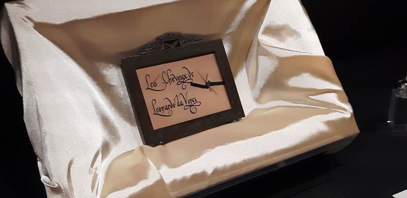 Alessandro Vezzosi, direttore del museo ideale, ha raccontato la storia del ritrovamento di queste reliquie, avvenuto nella cittadina francese in cui Leonardo morì. Arsene Houssaye, scrittore e ispettore provinciale dei musei della provincia francese, venne incaricato di trovare la tomba di Leonardo: una volta acquisito il feretro prese per sé dei capelli e un anello di bronzo trovati sul disegno di Leonardo. Questi reperti finirono nelle mani di un collezionista americano che proprio per questo anniversario, a distanza di 3 anni di lavoro, sono arrivati direttamente in Italia.