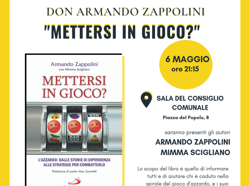 Lunedì 6 maggio alle ore 21,15 presso la Sala Consiliare del Comune di Santa Croce sull’Arno sarà presentato il libro “Mettiamoci in gioco?”. Si tratta dell’ultimo lavoro di Don Armando Zappolini, parroco, direttore della Caritas Diocesana e attivista nel campo dell’accoglienza, della legalità e della prevenzione delle dipendenze, e di Mimma Scigliano, giornalista, scrittrice e autrice.