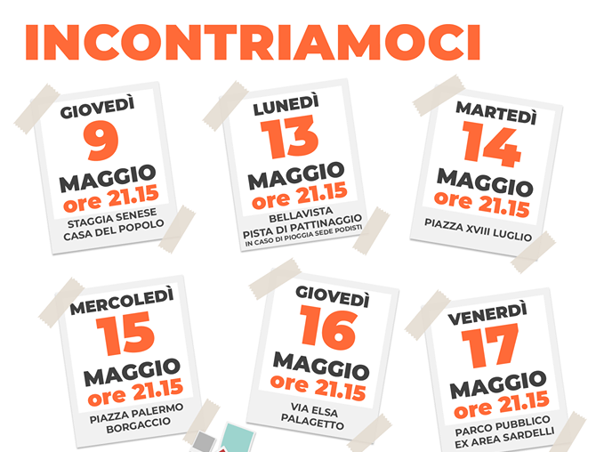 Gli incontri in agenda. Giovedì 9 maggio iniziano gli incontri serali, tutti a partire dalle 21,15. Il primo sarà a Staggia Senese, alla casa del popolo (via Romana) per proseguire poi lunedì 13 maggio a Bellavista (pista di pattinaggio), martedì 14 maggio in piazza XVIII luglio, mercoledì 15 maggio in piazza Palermo in Borgaccio, giovedì 16 in via Elsa al Palagetto e venerdì 17 maggio presso il parco pubblico dell'area ex Sardelli.