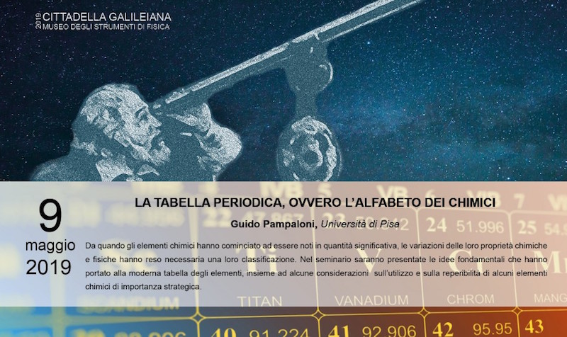 Alle ore 21, Guido Pampaloni, docente del dipartimento di Chimica e chimica industriale dell’Università di Pisa, terrà una conferenza dal titolo "La tabella periodica, ovvero l’alfabeto dei chimici". Nel seminario saranno presentate le idee fondamentali che hanno portato alla moderna tabella degli elementi, insieme ad alcune considerazioni sull'utilizzo e sulla reperibilità di alcuni elementi chimici di importanza strategica.
