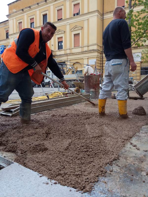 In corso la posa del calcestruzzo architettonico nelle aree perimetrali di Piazza del Popolo che si sta avviando agli ultimi giorni di lavoro in vista della sua definitiva riapertura al termine dell’intervento di riqualificazione.