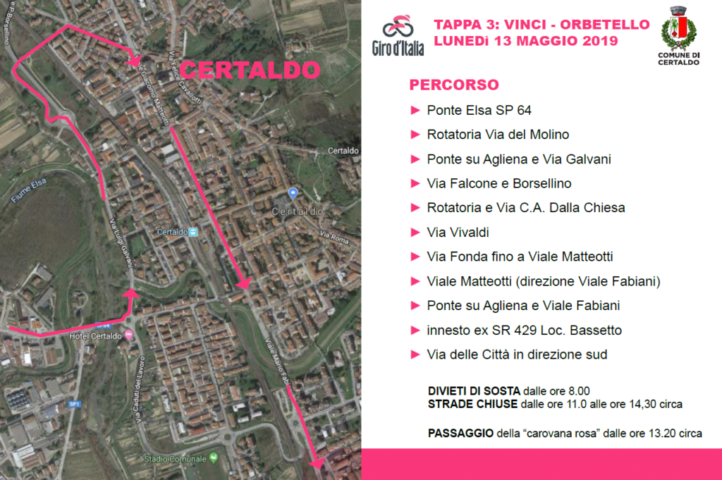 Tracciato: l’ingresso dei ciclisti nel territorio comunale di Certaldo è stimato intorno alle ore 13,20, arriveranno da Gambassi Terme scendendo da Fogneto e quindi attraverseranno il Ponte sull’Elsa della SP 64, la Rotatoria di via del Molino ed imboccheranno il Ponte sull’Agliena e Via Galvani, percorreranno quindi Via Falcone e Borsellino fino alla rotatoria con Via Dalla Chiesa, imboccheranno via Dalla Chiesa e dopo il sottovia stradale della ferrovia prenderanno Via Vivaldi, da qui sarà la volta di Via Fonda che percorreranno, anche contromano, fino al Viale Matteotti. Entrati in Viale Matteotti lo percorreranno in direzione di Viale Fabiani, transiteranno sul Ponte sull’Agliena, dalla rotatoria del Giappone, in Viale Fabiani fino all’innesto con il vecchio tracciato della SR 429 in località Bassetto, e poi su via delle Città, il vecchio tracciato della SR 429 appunto, fino al confine con il Comune di Barberino Val d’Elsa. Si stima che la parte terminale della “carovana rosa”, composta oltre che dai ciclisti da numerose moto e veicoli a supporto, uscirà completamente dal territorio comunale di Certaldo circa un’ora dopo esservi entrata e quindi che entro le 14.30 circa tutte le strade dovrebbero essere riaperte regolarmente al transito.
