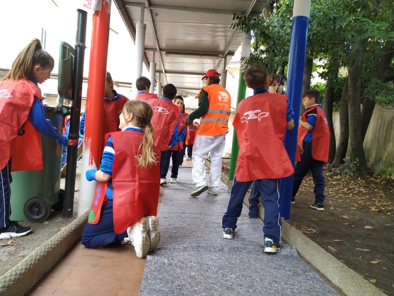 I bambini partecipanti, Angioletti del bello iscritti alla scuola primaria dai 6 al 10 anni, hanno accolto gli ospiti con una canzone di benvenuto scritta da loro, e successivamente, divisi in gruppi per fasce di età, sotto la supervisione dei volontari della Fondazione e dei genitori, hanno partecipato al camminpulendo ed alla pulitura e pittura delle colonne di ingresso alla scuola che erano anonime, grigie, ed ora sono dei colori dell’arcobaleno. L’intervento è stato, anche, allietato da un rap inventato dai ragazzi sulle tematiche ambientali e da un’ottima merenda per tutti.