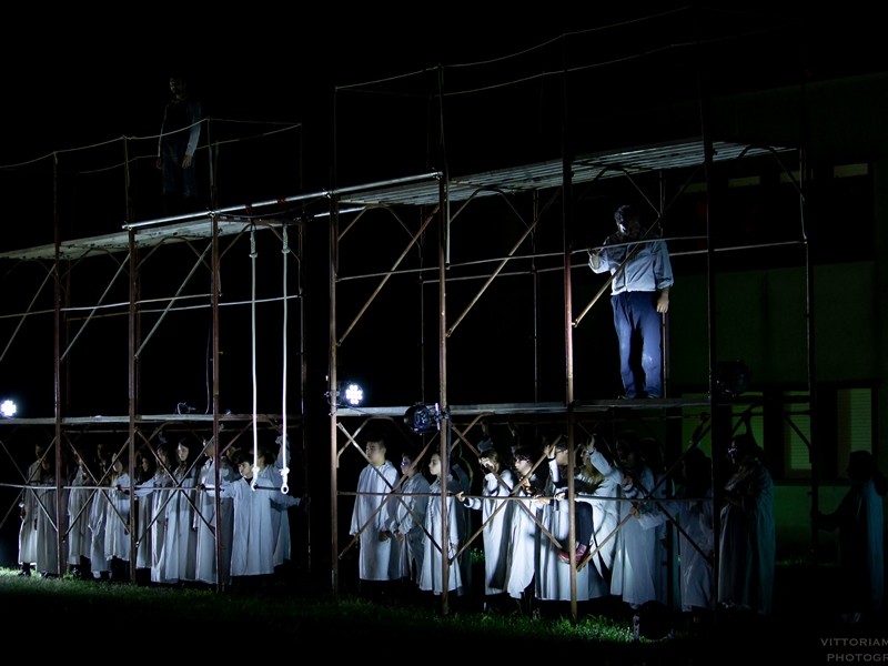 Anche le attrezzature sceniche e il luogo di ambientazione hanno fornito maggiore incisività al racconto, pensato e diretto magistralmente da Firenza Guidi in un percorso itinerante all’interno del giardino della scuola secondaria.