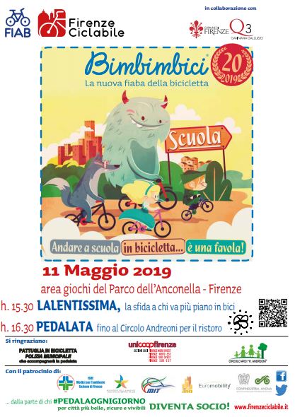 Domani, sabato 11 maggio torna Bimbimbici, la pedalata di FIAB Firenze Ciclabile dedicata ai bambini ed accompagnata dalla pattuglia dei Vigili in Bicicletta http://www.firenzeciclabile.it/evento.aspx?id=5654, che quest'anno sarà preceduta da Lalentissima (http://www.firenzeciclabile.it/attivita/la_lentissima.aspx) una sfida a chi va più piano per promuovere la moderazione della velocità dei mezzi a motore in città e che significa più sicurezza per le strade. La sicurezza stradale è purtroppo scarsamente presente nei programmi dei candidati alle prossime elezioni comunali.