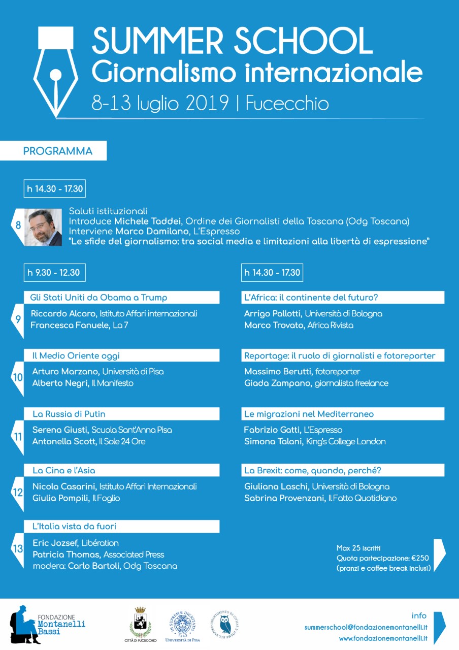 La Fondazione Montanelli Bassi, costituita da Indro Montanelli nel 1987, propone a studenti e a chi è già avviato alla professione giornalistica una settimana intensiva di studio e confronto sul giornalismo internazionale, tema spesso lasciato in secondo piano nella pubblicistica italiana. La scuola estiva, che si svolgerà presso la sede della Fondazione (Via G. di San Giorgio, 2 - Fucecchio- FI) dall’8 al 13 luglio, prevede lezioni e discussioni con la partecipazione di esperti – docenti universitari e giornalisti impegnati nelle diverse aree del mondo – che illustreranno sia le situazioni politiche e le criticità di ciascun continente, sia le forme e i problemi della comunicazione e della circolazione delle informazioni. Porre le basi per conoscere le realtà locali e sviluppare le competenze nella gestione delle informazioni costituiscono gli obiettivi principali di questa introduzione a una professione che – come diceva Montanelli – “… può anche diventare un’avventura, ma per guadagnarsela bisogna faticare molto…” tanto più nel mondo attuale, segnato da profondi cambiamenti nella formazione e nella comunicazione delle notizie.