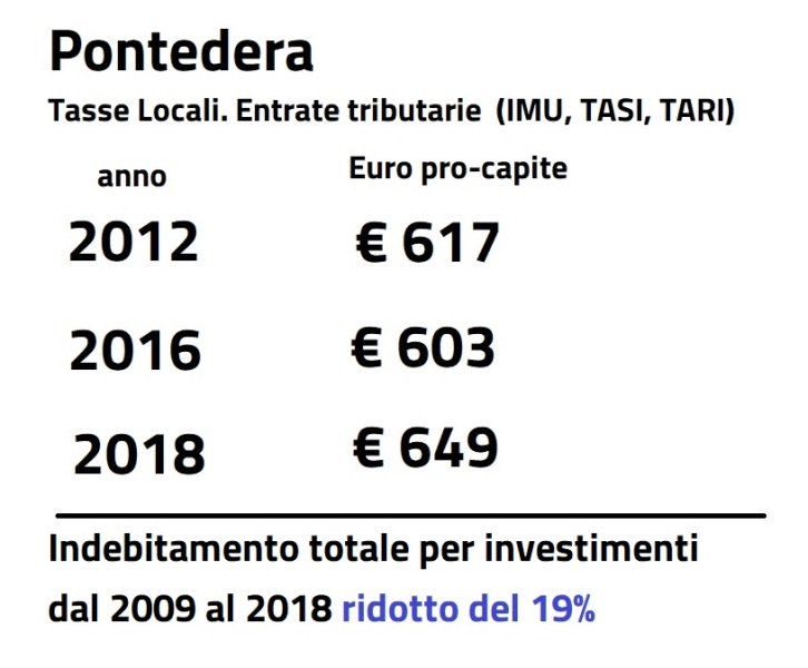 "Tasse raddoppiate? Forza Italia è in vena di dare i numeri! Mettono in un unico calderone e comparano grandezze, numeri e voci di bilancio che nel tempo sono cambiate (prima la TARI ad es non la riscuoteva il comune). Gli amici di Forza Italia farebbero bene, proprio nella terra di Fibonacci, a fare campagna elettorale senza offendere l'importanza dei numeri. Trascrivo* solo pochi dati per far capire che la tassazione locale a Pontedera è rimasta complessivamente stabile. Che è in corso da anni un percorso di riduzione della TARI. E che nel mio decennio il debito complessivo contratto per la realizzazione di opere pubbliche ed investimenti si è ridotto di un un quinto."
