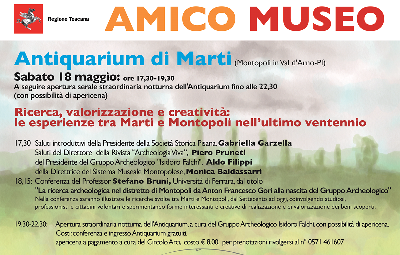 18 maggio a partire dalle ore 17,30: "Ricerca, valorizzazione e creatività: le esperienze tra Marti e Montopoli nell’ultimo ventennio". Dopo i saluti istituzionali, alle 18.15 si svolgerà la conferenza dal titolo "La ricerca archeologica nel distretto di Montopoli da Anton Francesco Gori alla nascita del Gruppo Archeologico" a cura del Professor Stefano Bruni (Università degli Studi di Ferrara).