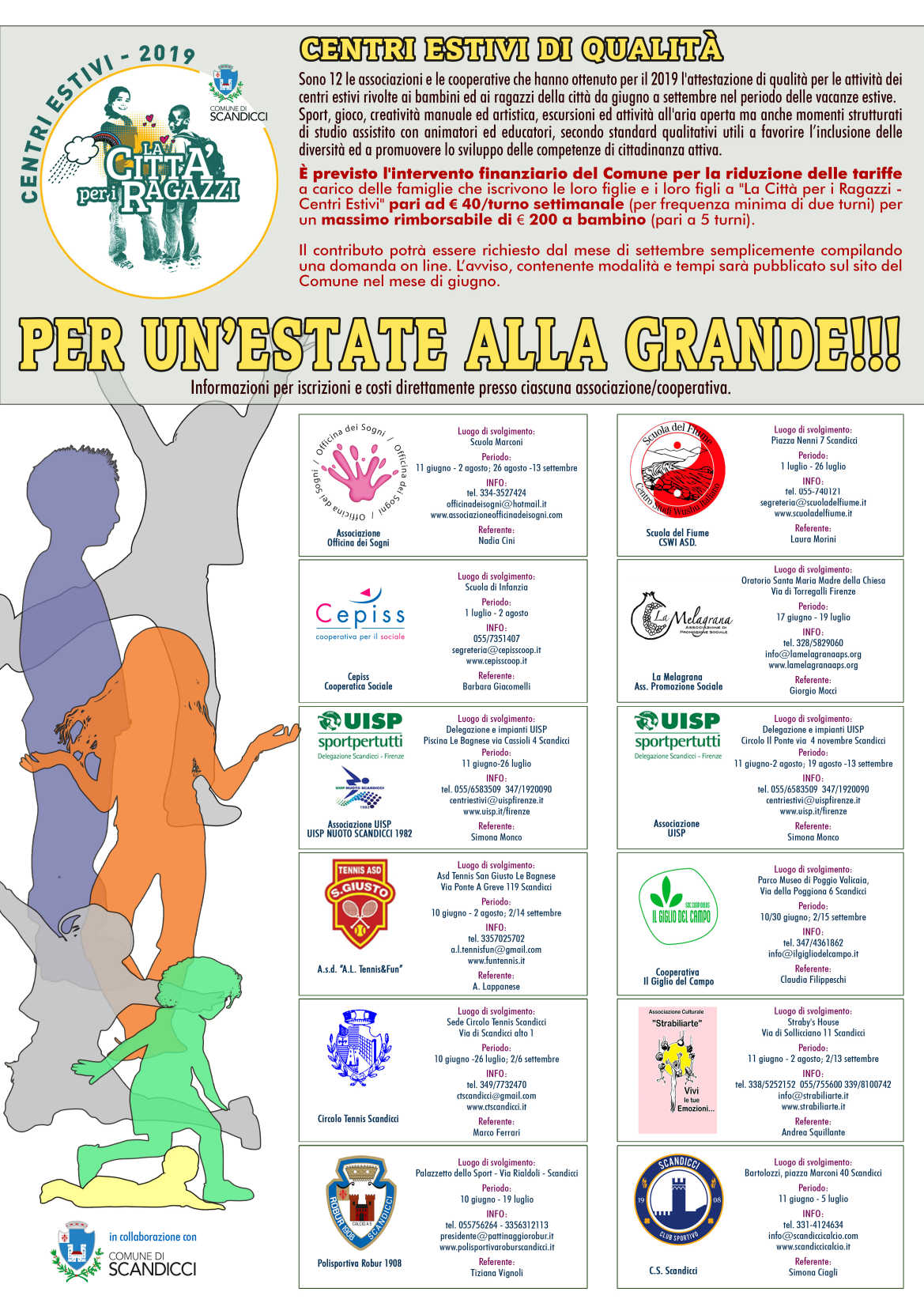 Rimborsi del Comune fino a 200 euro a bambino per le famiglie di Scandicci che quest'estate iscriveranno i propri figli ai Centri Estivi per almeno due turni, presso 12 associazioni e cooperative che hanno aderito al progetto Centri Estivi di Qualità ideato e promosso dall'Amministrazione comunale. I centri estivi sono quelli dell'Officina dei Sogni (dall'11.6 al 2.8 e dal 26.8 al 13.9), del Cepiss (dall'1.7 al 2.8), della Uisp Nuoto Scandicci 1982 (dall'11.6 al 26.7), del Tennis Asd San Giusto Le Bagnese (dal 10.6 al 2.8 e dal 2.9 al 14.9), del Circolo Tennis Scandicci (dal 10.6 al 26.7 e dal 2.9 al 6.9), della Polisportiva Robur 1908 (dal 10.6 al 19.7), della Scuola del Fiume Cswi Asd (dall'1.7 al 26.7), l'Estate Ragazzi presso l'oratorio di Torregalli dell'associazione La Melagrana (dal 17.6 al 19.7), i centri estivi della Uisp (dall'11.6 al 2.8 e dal 19.8 al 13.9), de Il Giglio del Campo presso il parco di Poggio Valicaia (dal 10.6 al 30.6 e dal 2.9 al 15.9), dell'associazione Strabiliarte (dall'11.6 al 2.8 e dal 2.9 al 13.9) e del Club sportivo Scandicci (dall'11.6 al 5.7). Il contributo del Comune per la riduzione delle tariffe delle famiglie che iscrivono i figli ai centri estivi di queste 12 associazioni e cooperative è pari a 40 euro a turno settimanale (nel caso di partecipazioni a tempo parziale il contributo sarà proporzionato al servizio usufruito) per una frequenza minima di due turni e per un massimo rimborsabile di 200 euro a bambino (pari a 5 turni). Le famiglie potranno chiedere i contributi a settembre compilando una domanda on line; l'avviso, contenente modalità e tempi, sarà pubblicato sul sito del Comune nel mese di giugno.