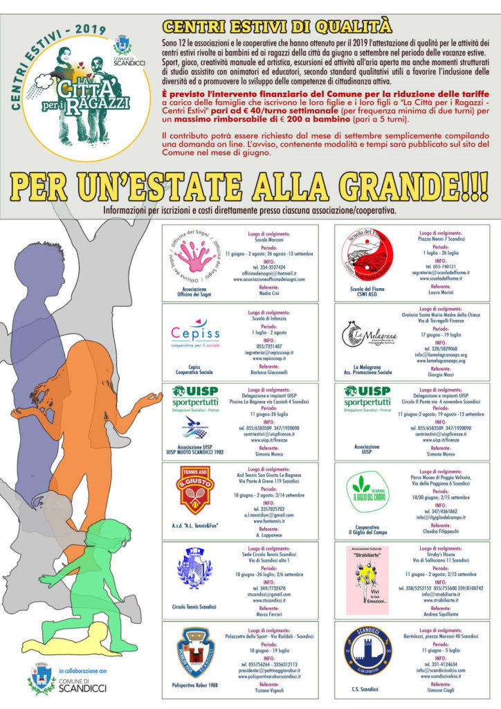 Da anni il Comune di Scandicci cura la promozione, il coordinamento e la pubblicizzazione delle attività estive per bambini e ragazzi, organizzate dalle realtà associative e cooperative locali, offrendo supporto logistico con la pubblicizzazione, la messa a disposizione di scuolabus per gite e spostamenti, la richiesta di locali alle Istituzioni scolastiche, oltre all'erogazione di contributi che però fino allo scorso anno erano riservati esclusivamente alle famiglie con disagio economico.